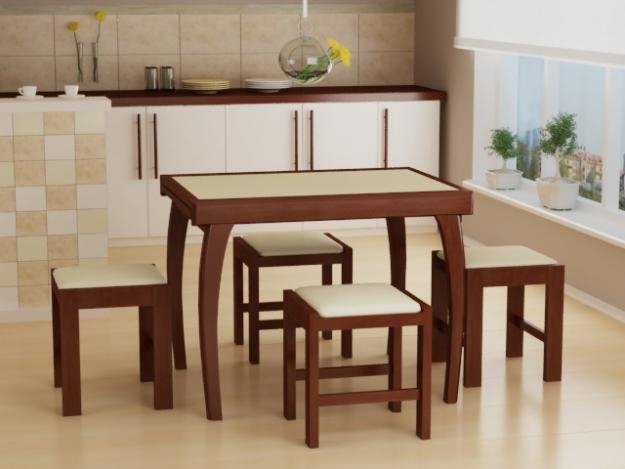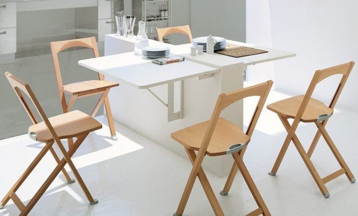 يمكن أيضًا طي كراسي هذه الطاولات ، والتي يتم إخفاؤها في مكان مناسب في أي جزء من الشقة ، وإذا لزم الأمر ، يتم تنفيذها وتتكشف. استخدام البراز هو ممكن أيضا ، فإنها تأخذ مساحة أقل. ومع ذلك ، إذا كانت العائلة تحب الأعياد الطويلة ، فلن يكون خيار البراز مريحًا للغاية.