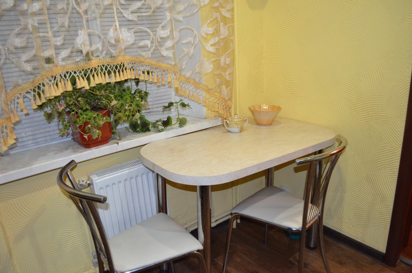 طاولة في الزاوية وكراسي قابلة للطي لمطبخ صغير