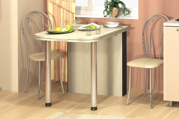اليوم ، هناك عدد كبير من طاولات المطبخ ، المحولات. يمكن أن تكون نماذج مستديرة أو بيضاوية. عند التجميع ، تبدو مثل هذه العينة خزانة صغيرة ضيقة لتخزين الأطباق ، في مثل هذا المطبخ الصغير لن يتداخل هذا البناء مع المضيفة ويسمح لك بالتنقل أثناء الطهي دون أي مشاكل. مع وجود عدد صغير من الأشخاص ، من الممكن رفع جانب واحد من مربط الحبال وجعل سطحًا شبه دائريًا ، يكفي لتناول الوجبات لشخصين أو ثلاثة أشخاص. إذا كنت تخطط لاستقبال عدد كبير من الضيوف - طاولة لمطبخ صغير ، فيمكنك الابتعاد عن الحائط ورفع النصف الثاني من القوس. وبالتالي ، سيكون من الممكن وضع ما يصل إلى 8 أشخاص على الطاولة.