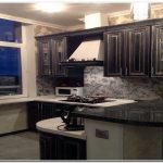 5. المطبخ شكل غير منتظم. تتيح لك هذه الخيارات تنظيم المساحة بشكل غير قياسي ، ولكن يسمح لك دائمًا بتحديد مثلث عامل في مكان مناسب حتى لا تنتقل المضيفة عبر المطبخ بأكمله من الحوض إلى الثلاجة أو الموقد. إذا تم الجمع بين المطبخ وغرفة ، فمن المنطقي أن تفصل بينها مع عداد شريط ، والتي يمكن أن تحل محل منطقة الطعام.
