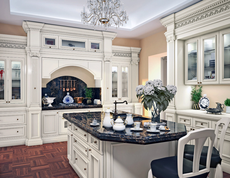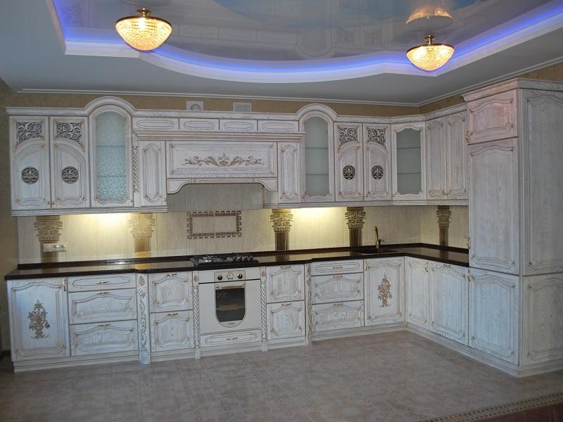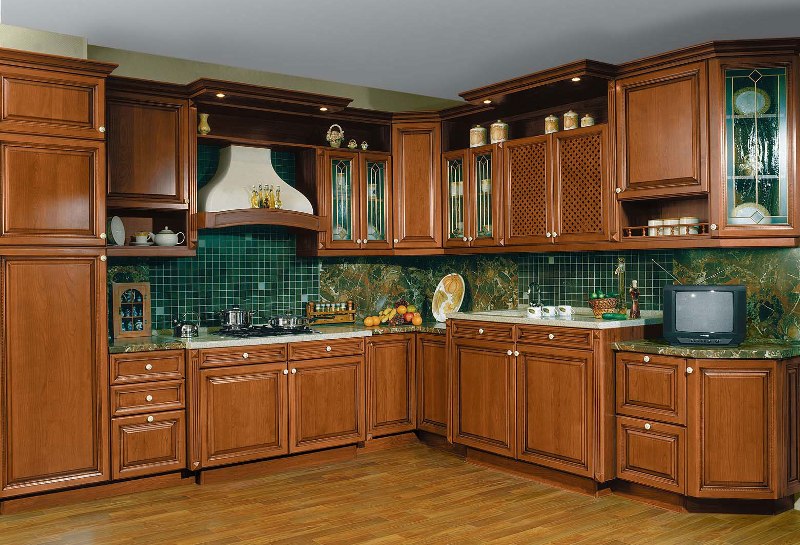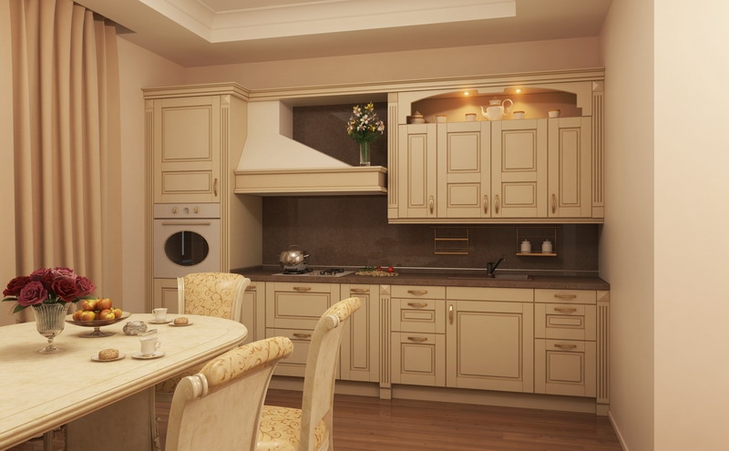 إن النحت الأصلي على الواجهة والتجهيزات الجميلة والجودة والجمال الجيد للشجرة هي السمات المميزة للكلاسيكيات. وستسمح لك السقوف العالية في المطبخ بوضع المطبخ في السقف.