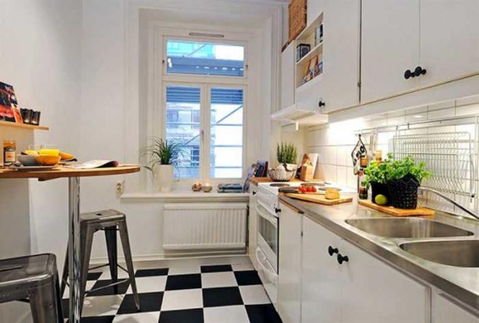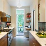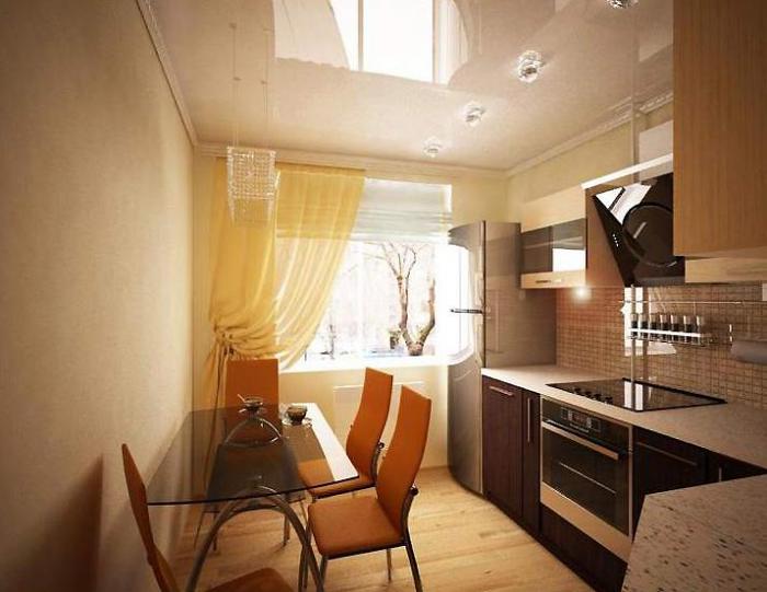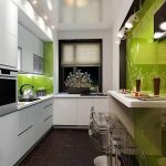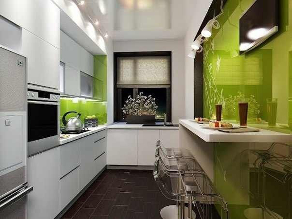 في الغرف من النوع المتسلسل ، يكون الترتيب الخطي للأثاث مناسبًا في أغلب الأحيان ، ولكن يمكنك أيضًا عمل تصميم على شكل حرف L ، إذا قمت بتوسيع عتبة النافذة إلى الطاولة وجعل منطقة عمل أو مغسلة هناك. لمثل هذه الأماكن ، استخدم الخزائن ذات العمق الضحل والأجهزة الضيقة. يمكن وضع وحدات قابلة للتمدد عموديًا لتوفير المساحة وتخزين العناصر الصغيرة المختلفة. بدلاً من الجدول المعتاد ، يمكنك إنشاء عداد شريط.