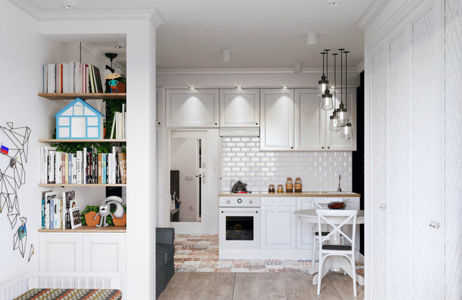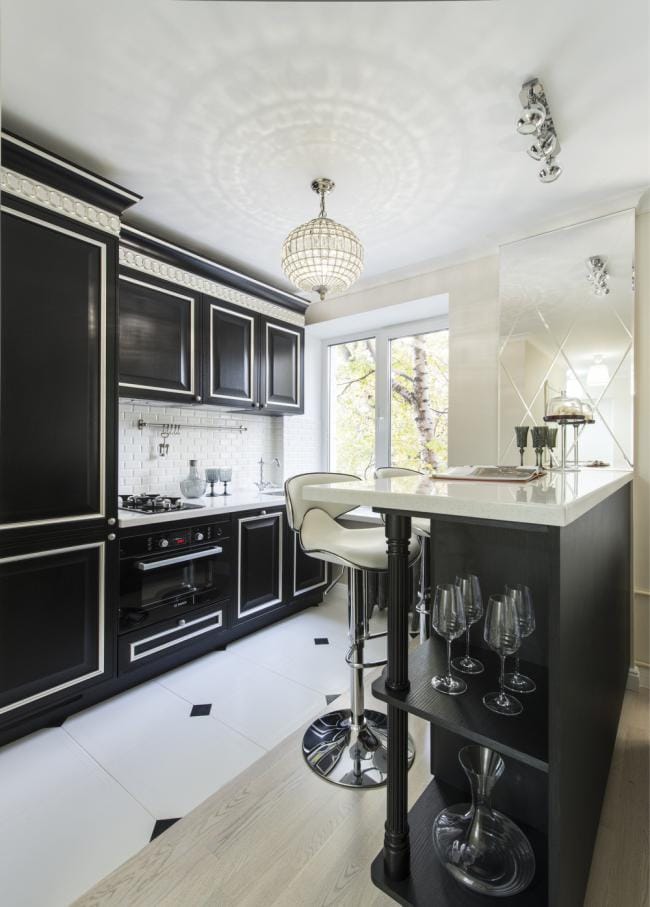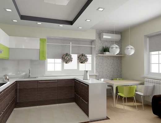 ستتيح لك هذه المساحة اختيار أي طراز من مجموعات المطبخ. على شكل حرف U ، وسطران كذلك. وفي الوسط ، يمكنك تنظيم جزيرة بها منطقة عمل ، أو فصل منطقة تناول الطعام منضدة بار.