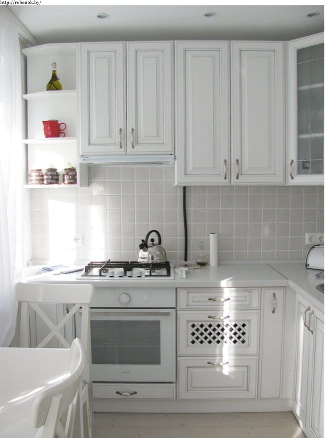 4.للمطابخ الصغيرة (5-6 متر مربع) مجموعات المطبخ المناسبة مع الحد الأدنى من مجموعة الأدراج. من الأفضل استبدالها بأرفف مفتوحة. إذا كان هناك شرائط ضيقة من الفضاء بين الأجهزة ، يمكنك تضمين رف ضيق أو وحدة أرضية ضحلة.
