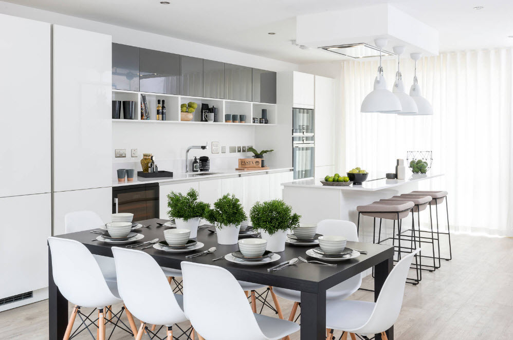 يتم دائمًا دمج مجموعات المطبخ الأنيقة بالألوان مع باقي أجزاء المطبخ الداخلية. يجب أن تكون جميع أنظمة التخزين وأسطح العمل في نظام ألوان مشترك مع الأثاث وورق الجدران والمنسوجات.