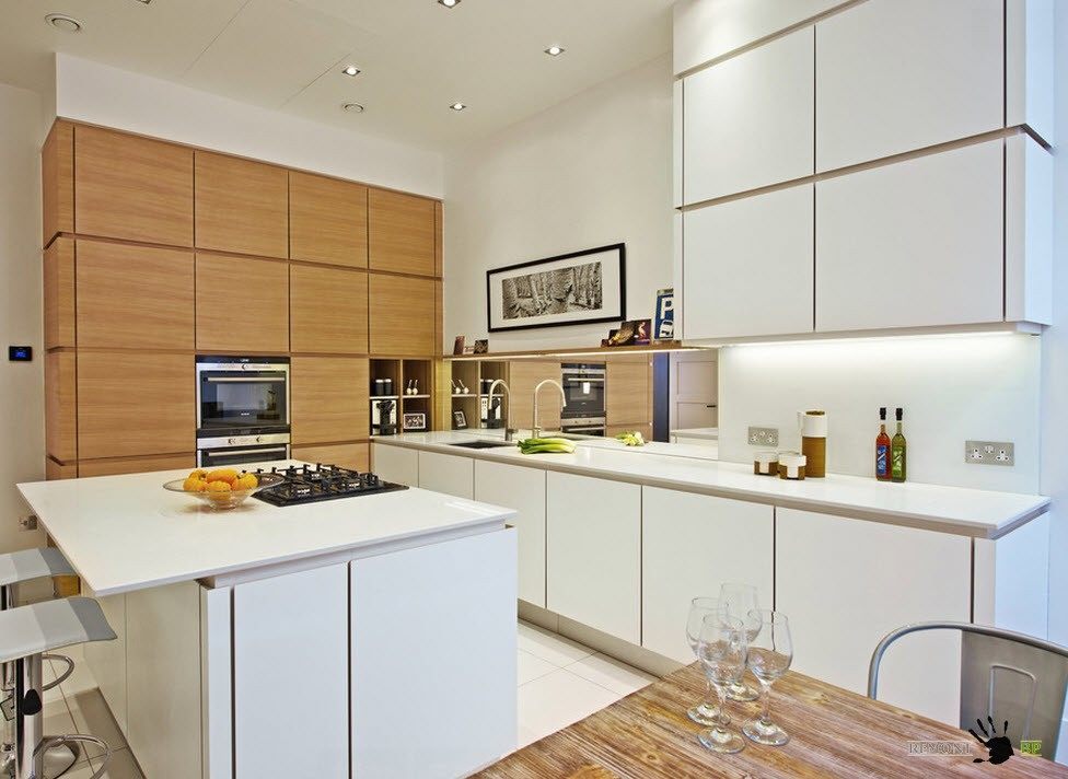 الفكرة الأكثر تنوعا ومريح لمجموعة المطبخ ، لأن جميع المناطق على مسافة قريبة ويمكنك بسهولة تنظيم منطقة لتناول الوجبات. هذه السماعات أكثر رحابة من تلك الخطية المعتادة ، ويتم اختيار التصميم لكل ذوق.