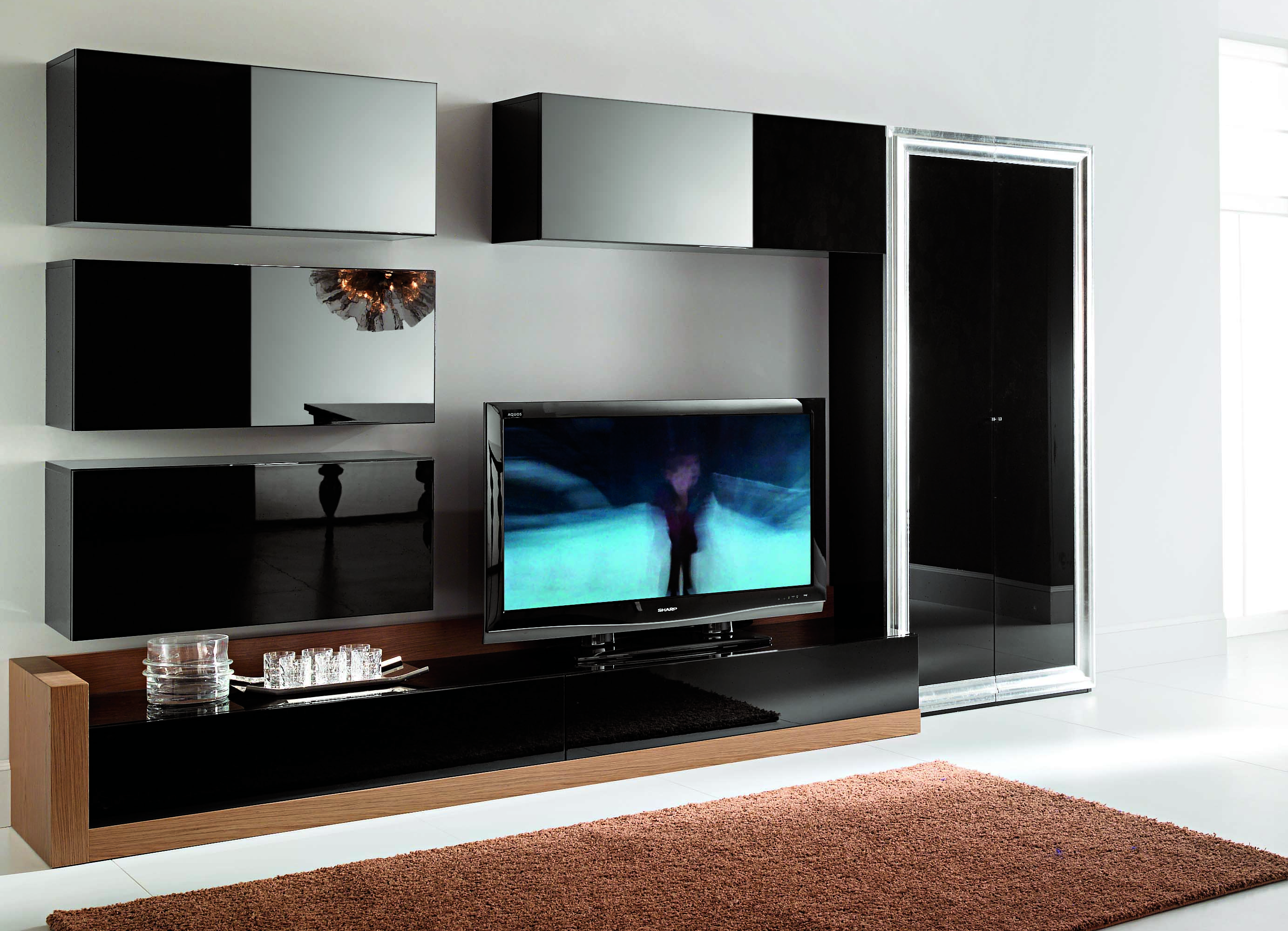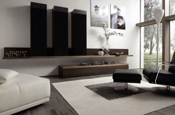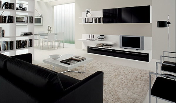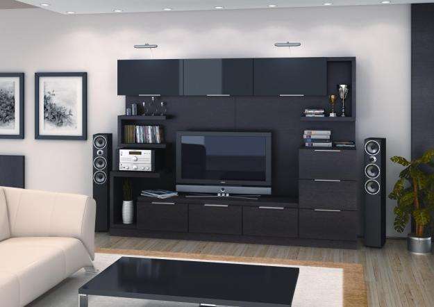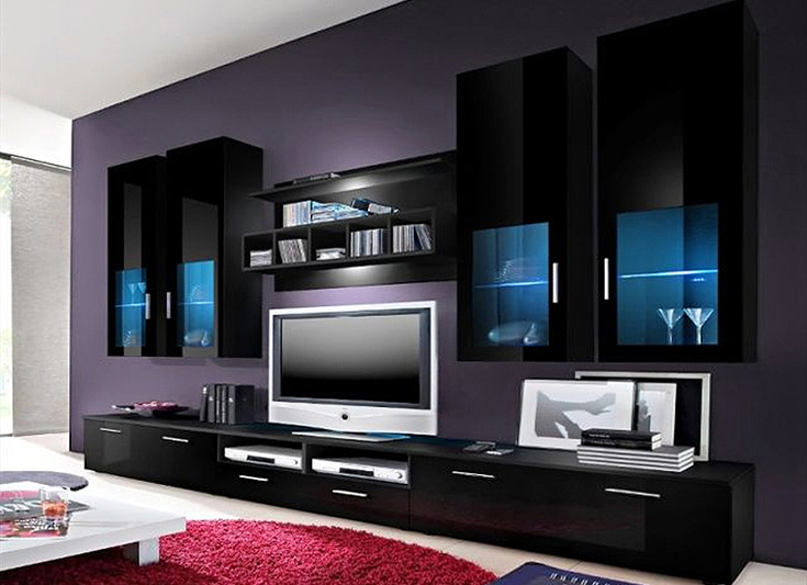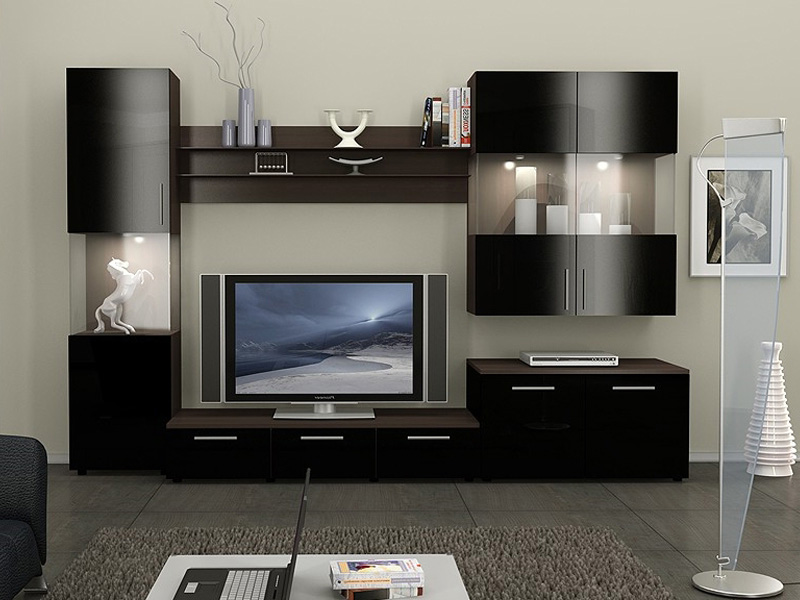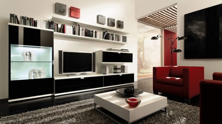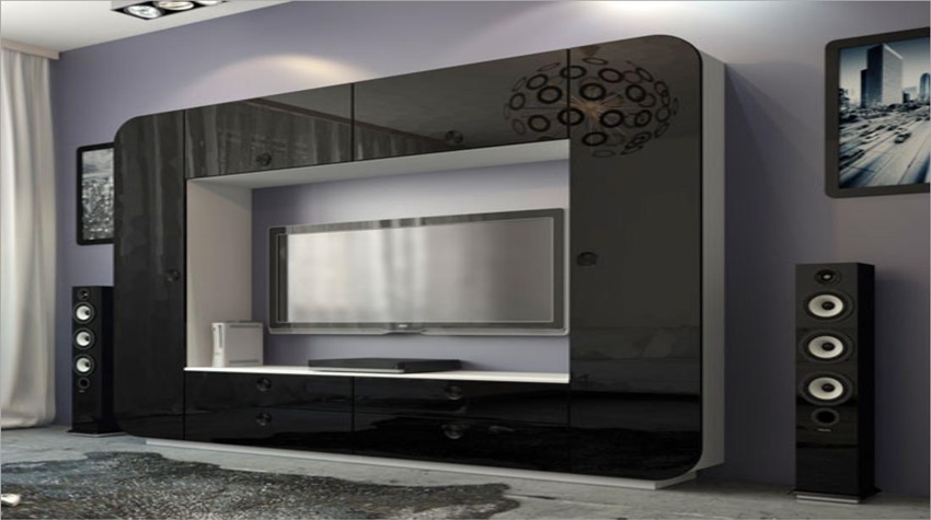 عند اختيار أثاث خزانة لغرفة المعيشة ، فإن الشيء الأكثر أهمية هو تجنب الحمل الزائد الأسود. طاولة ، أرفف أسفل التلفزيون ، إذا سمحت أبعاد المساحة ، فمن المستحسن اختيار فتح أو مع أبواب زجاجية للكتب.