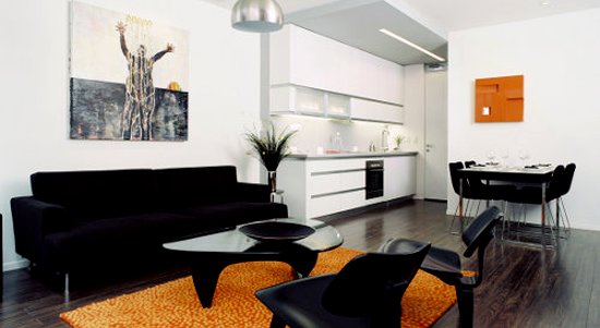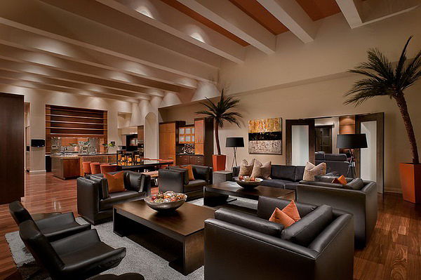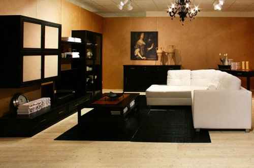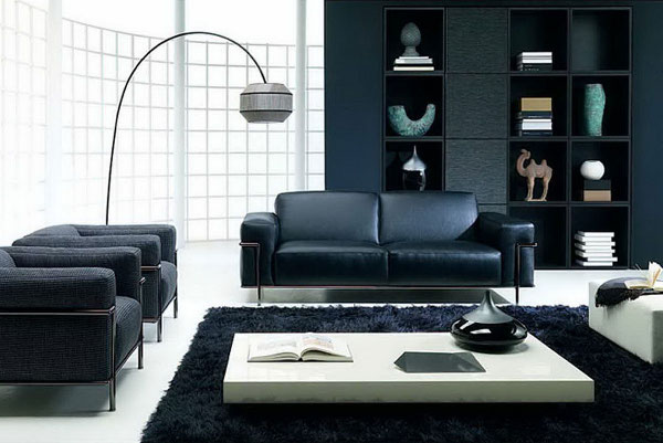 أثاث أسود ممتاز لغرف المعيشة الفسيحة والمشرقة. الديكور يمكن أن يكون متناقضا وأحادي اللون. الشرط الرئيسي - يجب أن تكون جميع المفروشات والديكور في وئام مع بعضها البعض.