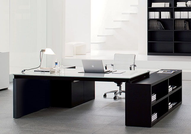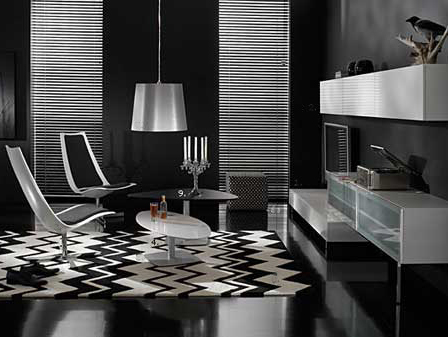 أثاث أسود مع أشكال لاكونية على خلفية الجدران البيضاء المبهرة.