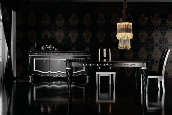 غالبًا ما يوضع أثاث أسود على خلفية الجدران ، مزين بورق حائط مزخرف. في الوقت نفسه ، لا يغطي النموذج دائمًا جميع الجدران ، وغالبًا ما يتم دمج خلفيات منقوشة مع رتابة في المستوى الرأسي أو الأفقي. مجموعات ناجحة ليس فقط مع خلفية بيضاء أو سوداء وبيضاء ، ولكن مع ظلال أحادية اللون أخرى: