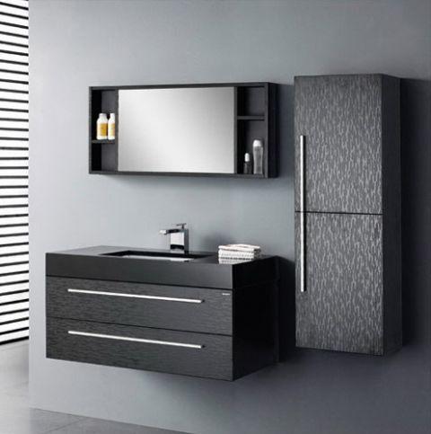 كيفية دمج اللون الأسود في تصميم الحمام باستخدام الأثاث؟ بالطبع ، استخدم أنظمة التخزين.