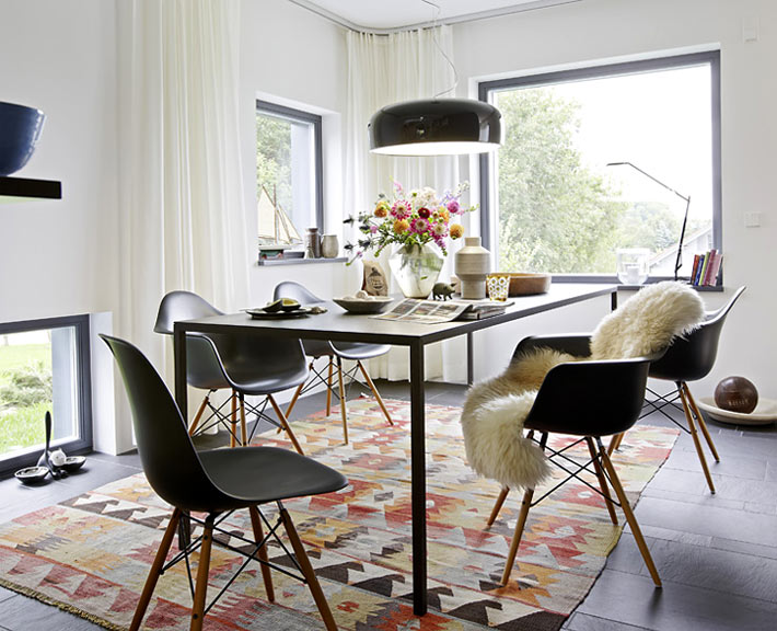 يمكن أن تكون الزخرفة الداخلية الناجحة عبارة عن لوحة حديثة بنقش تجريدي أو حيوان. نظرة أنيقة الصور بالأبيض والأسود. السجاد والسجاد مع أنماط هندسية من الألوان الزاهية - وسيلة رائعة لتخفيف الداخلية ، وإعطائها حيوية وحيوية.
