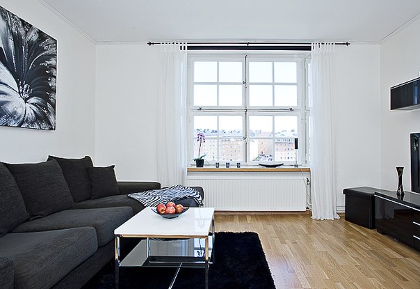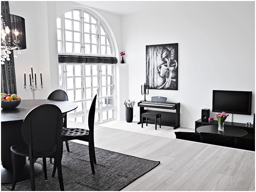 سوف يتناقض الأثاث المنجد مع المفروشات السوداء في غرفة المعيشة ، مزينة باللونين الأبيض والرمادي.
