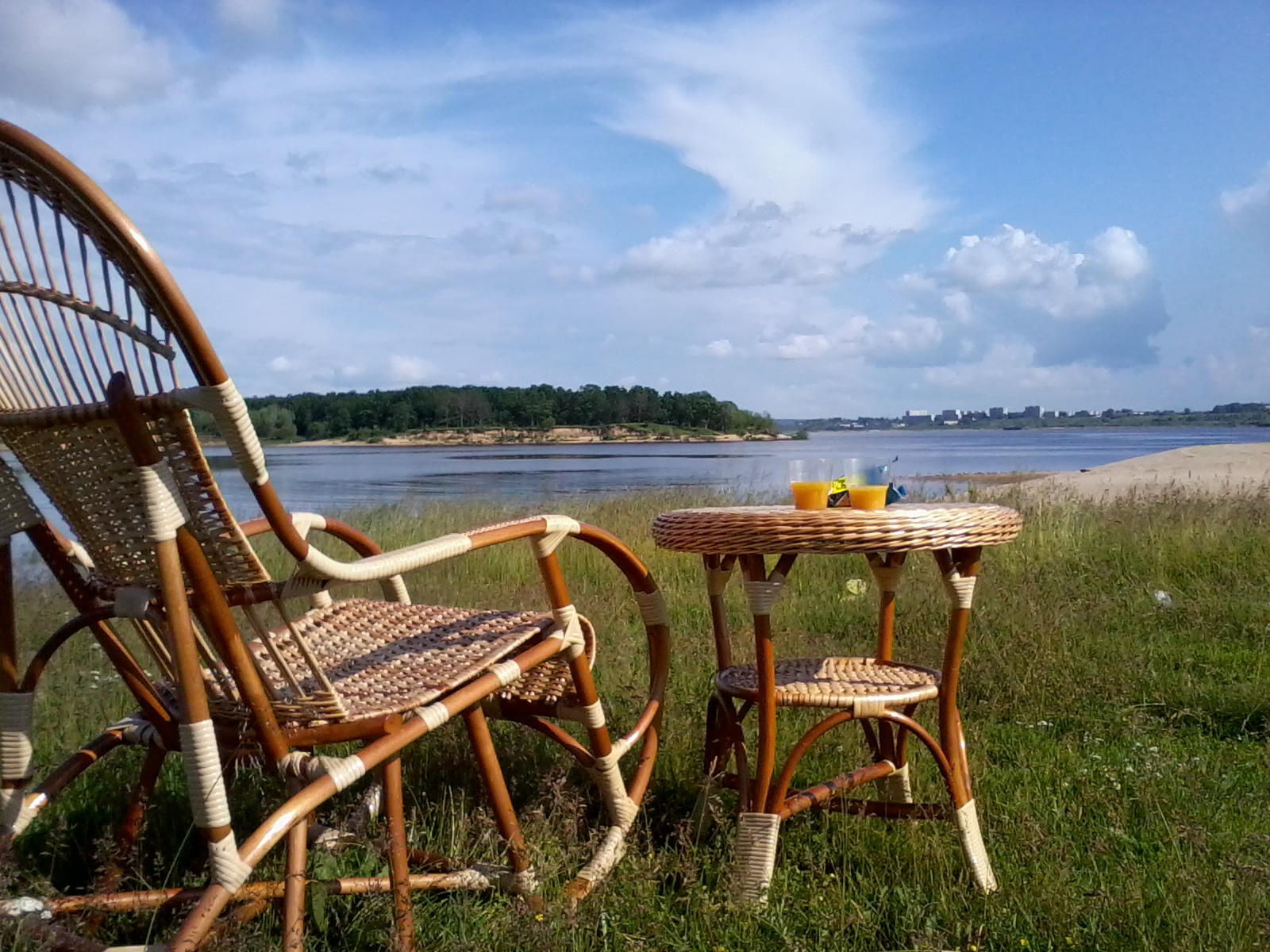 طاولة وكراسي ذاتية الصنع على العشب الأخضر