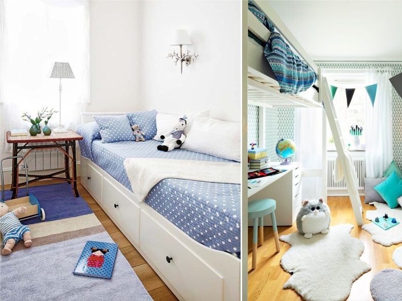 بالإضافة إلى ذلك ، لتخزين لعب الأطفال والأشياء ، يمكنك استخدام ما يسمى بمنطقة "النسخ الاحتياطي" في الغرفة - المساحة أسفل عتبة النافذة وتحت السرير وفي الزوايا.