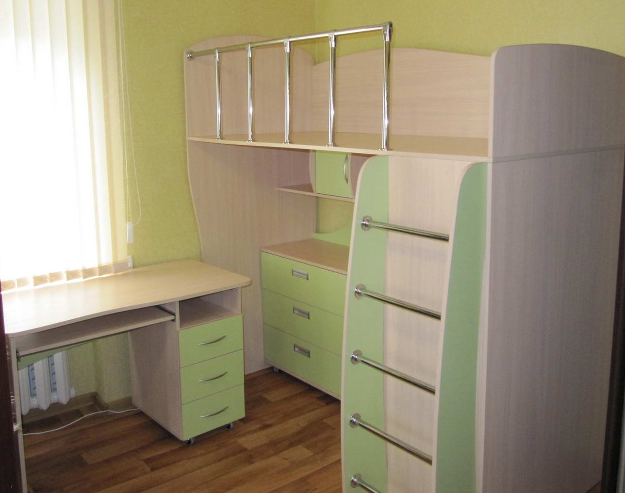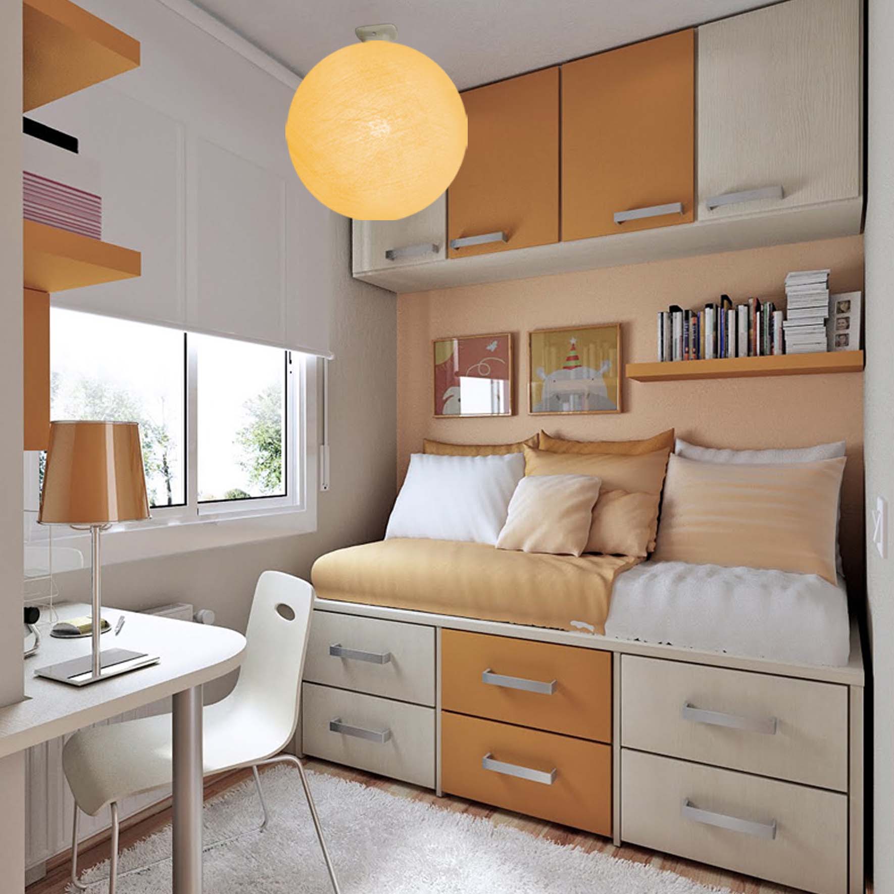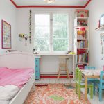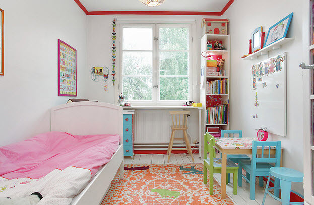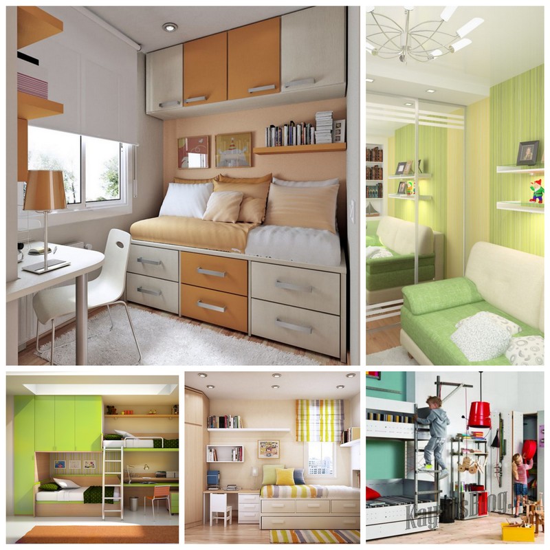 بدلاً من خزانة ملابس الأطفال ، يعد السرير ذو الأدراج الواسعة في الأسفل مناسبًا ، حيث يمكنك وضع الملابس وملاءات الأسرة. يجب وضع الطاولة والكراسي على النافذة. للاكتناز ، يمكنك اختيار خيار للطي.