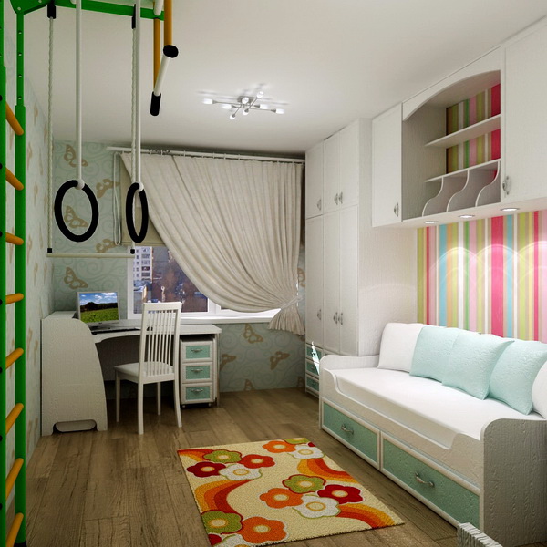 يمكن استخدام مساحة زاوية غرفة الأطفال بوضع خزانة صغيرة ضيقة مع أرفف في هذا المكان.بالنسبة للطفل الأكبر سنًا ، يكون الخيار بجدار سويدي هو الأفضل.