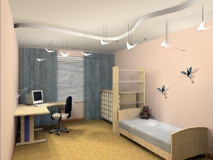 لجعل غرفة الطفل أكثر اتساعًا ، يمكنك "ترتيب" لهجات بصرية. يتم ذلك بمساعدة أنماط مفردة ساطعة ، مزيج متناقض من الألوان (نغمات طبيعية). الأثاث في اللون قد تختلف عن ورق الحائط. يتم اختيارهم بألوان أفتح. بالنسبة لغرفة الطفل ، يوصى باستخدام الألوان المملة (باستثناء لهجات في شكل رسومات أو زخارف أو تطبيقات).
