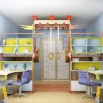 إذا كانت الحضانة لها مكانة ، فمن الجيد أن تضع خزانة ضيقة مع الميزانين. أفضل رفوف مصنوعة وظيفية. إذا سمحت المساحة ، فيمكن استخدامها للألعاب والكتب والألعاب.