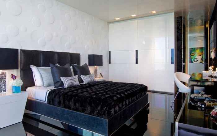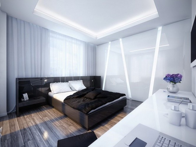 - غرفة بيضاء مع الأسود أثاثش - أنيقة ، متناقضة ، بشكل واضح. مناسبة لأي أسلوب.