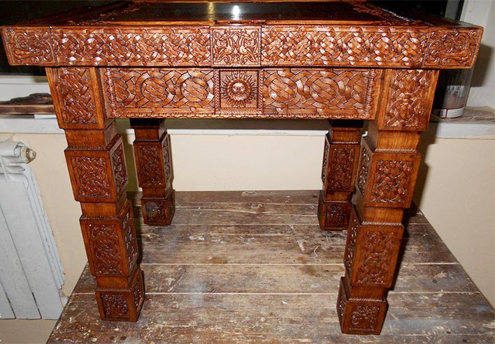 غالبًا لتزيين المنتجات الخشبية المستخدمة في صنع العناصر المنحوتة على الواجهات والأبواب ، وأحيانًا يكون الأثاث مزينًا بنقش يستخدم الطلاء المحترق أو الخاص.