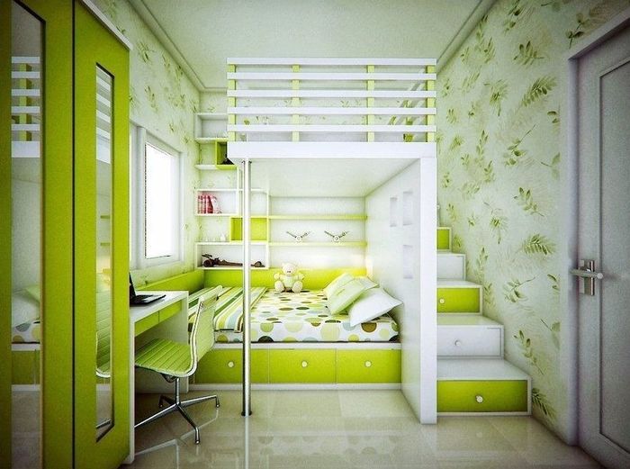 يتمثل الحل الأصلي في الجمع بين مناطق الدراسة والراحة والتخزين بمساعدة سرير علوي من مستويين ، والذي قد يتضمن مكتب كمبيوتر وخزانة ملابس مع مساحة مخصصة. يقع الرصيف في الطابق العلوي.