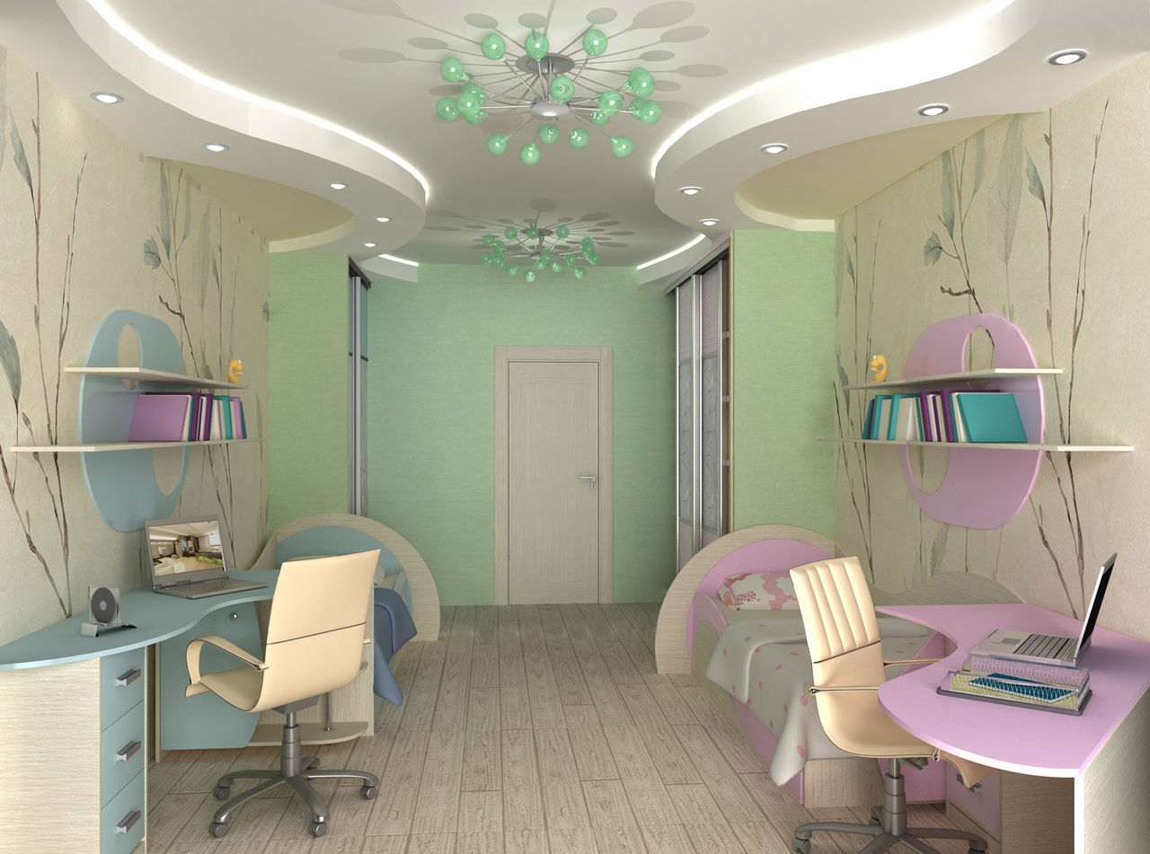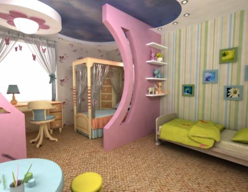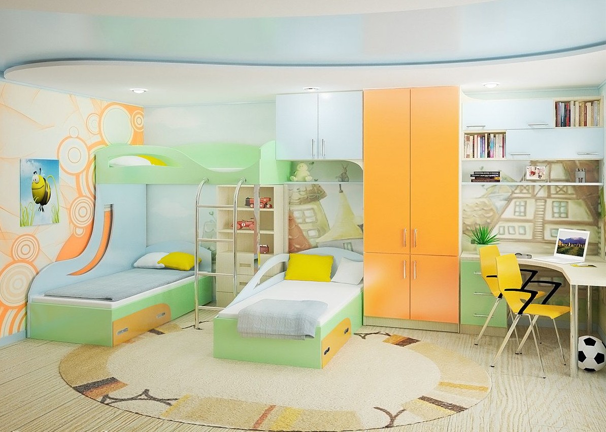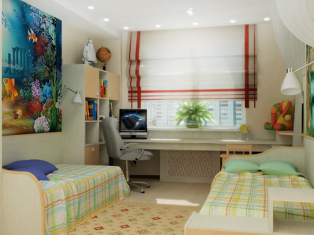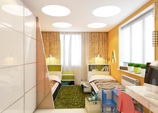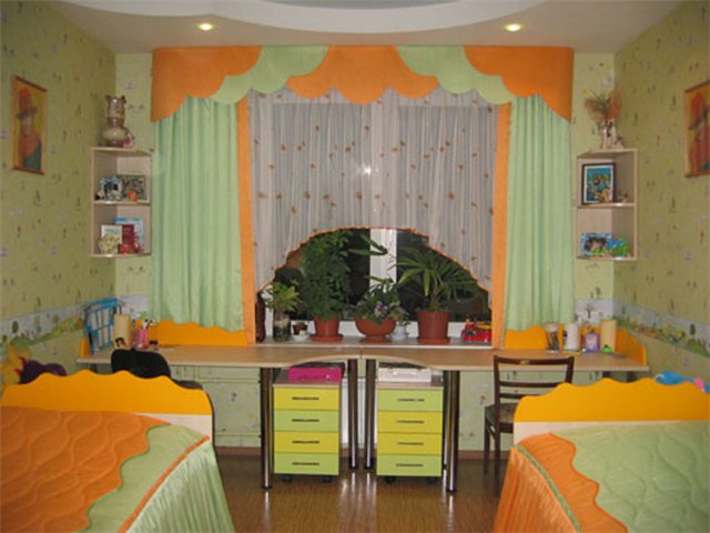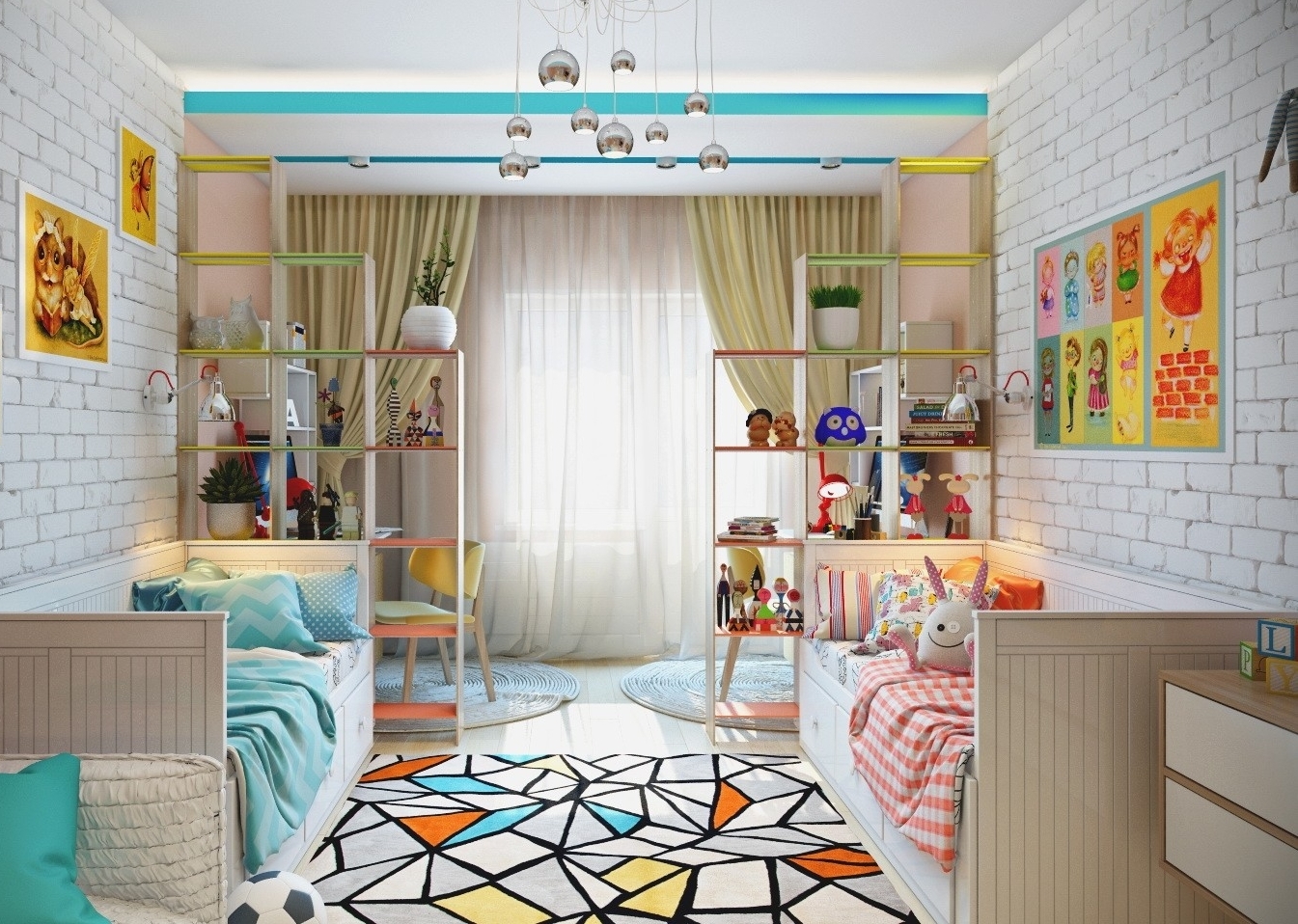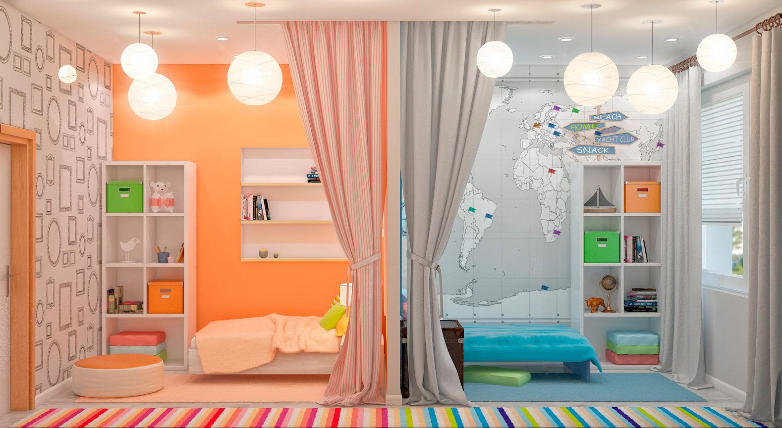 طفلان هما شخصان ، بسبب الظروف ، يقسمان غرفة واحدة. للحصول على طول سيكون عليهم تقديم حل وسط في مسائل التصميم الداخلي. إذا كان أطفال من جنسين مختلفين ، فمن الأفضل تقسيم الغرفة بصريًا إلى قسمين باستخدام الستائر أو الشاشة وإضافة منطقة مشتركة. ضعه في خزانة للملابس والأغراض الشخصية. يجب أن يكون قسم خاص به لكل طفل. في نفس المكان ، ضع مجموعة أطفال من الطاولة والعديد من الكراسي - قد يأتي الضيوف إلى أطفالك.