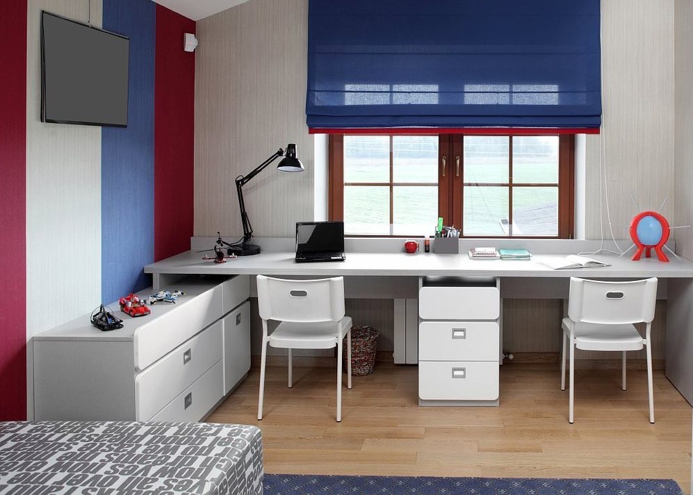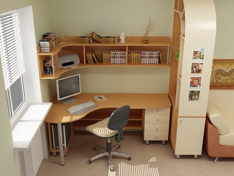 لديه مواضيع جديدة - الكتب المدرسية ، والكتب ، وأجهزة الكمبيوتر المحمولة ، والكثير من الأشياء الصغيرة الضرورية ، وبطبيعة الحال ، جهاز كمبيوتر شخصي. لتخزين هذه الثروات من تلميذ الشباب والقيام بالواجب المنزلي ، فأنت بحاجة إلى سطح مكتب مجهز بشكل صحيح. إذا سمحت المساحة وتكوين الغرفة ، فقم بشراء مكتب كمبيوتر واسع الزاوية. ضعه في الزاوية بالقرب من النافذة.