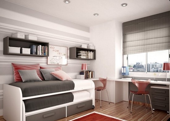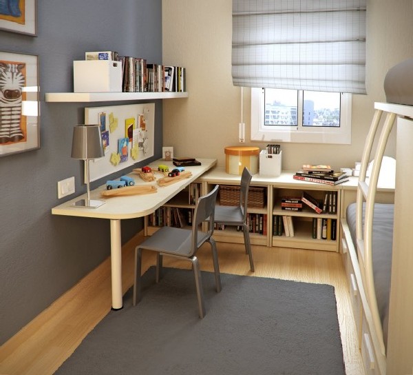 سيكون الحل الأصلي هو مزيج من مناطق الدراسة والترفيه والتخزين باستخدام سرير علوي من مستويين.