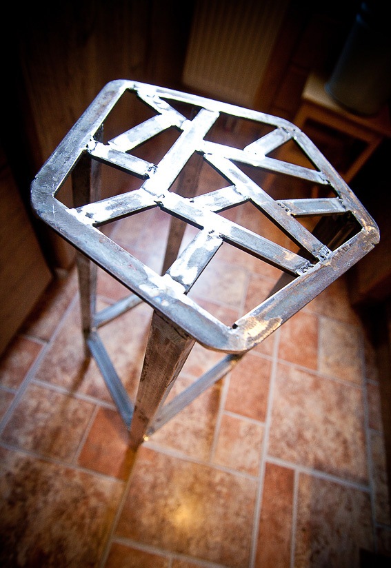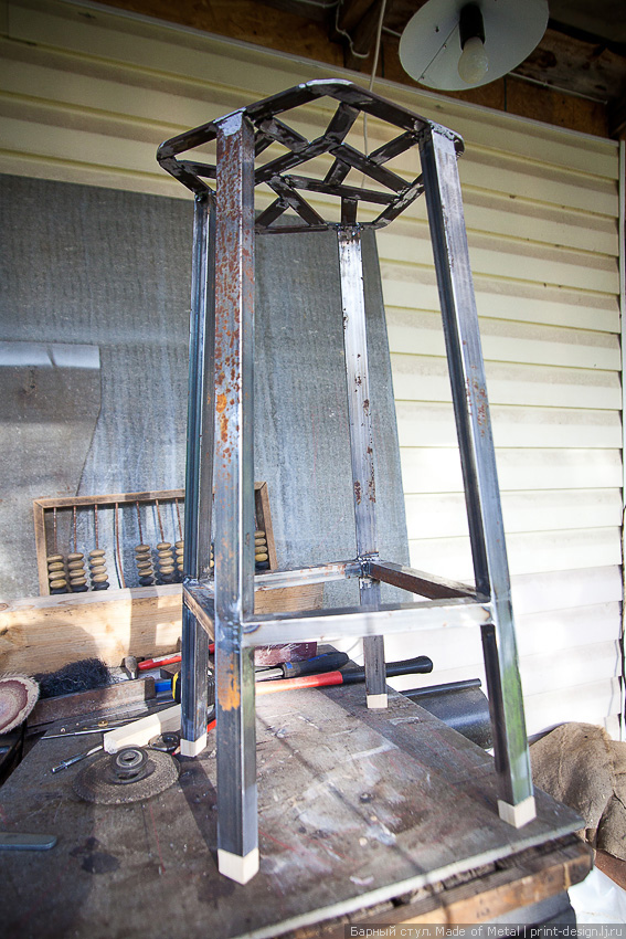 ننتقل إلى تصنيع الأرجل ، ونصنعها من شريط مقاس 50 × 50 ملم. تأكد من الحفاظ على الهيكل في وضع مستقيم. انشر الطائرة بطول كامل ، بحيث كان المقطع العرضي في أسفل الساقين 2.5 × 2.5 سم ، والتعلق بالمقعد أكثر سماكة.