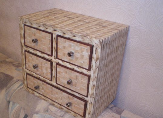 خزانة صغيرة من الأدراج مصنوعة من الورق المقوى للديكور ومستحضرات التجميل وتقنية decoupage. الرقم مع المناديل نقل بلطف إلى المنتج ، وذلك باستخدام مزيج من الماء ، والغراء. تستخدم مع فرشاة ، غمس في الغراء.
