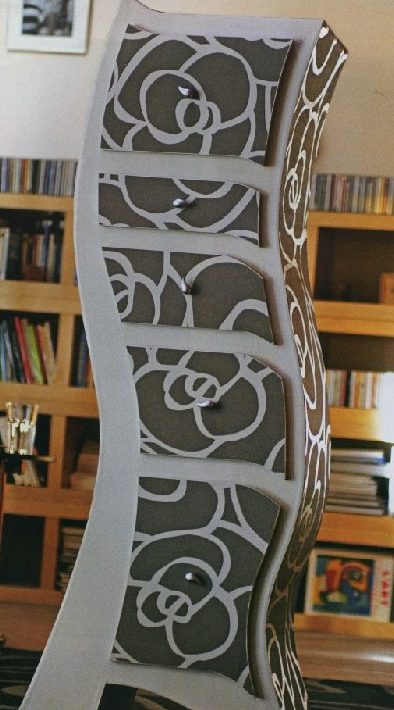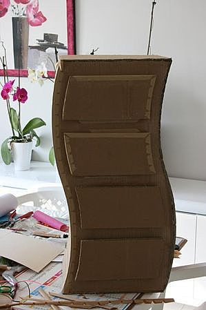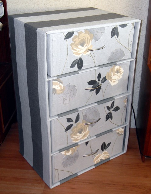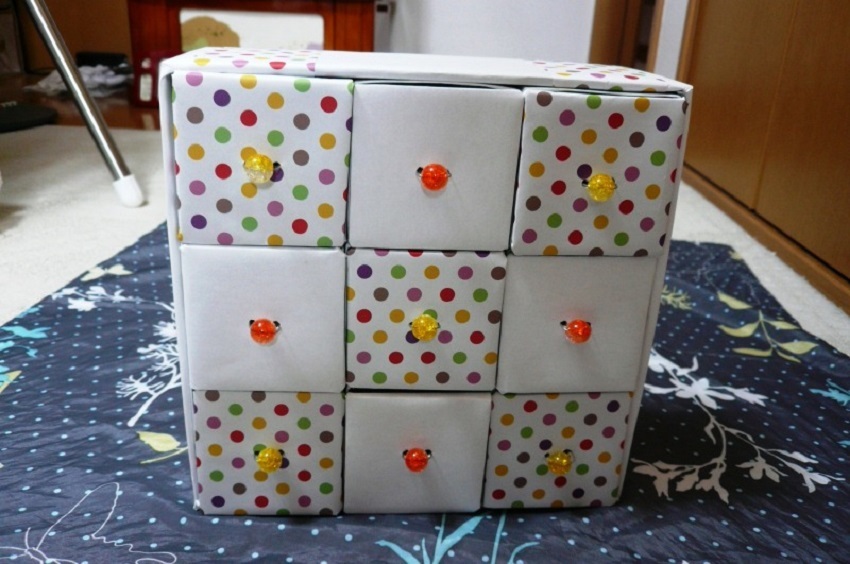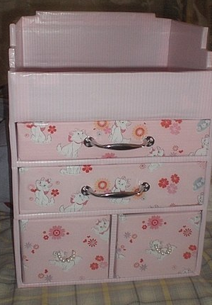 بعد تعريضك للكرتون للزخرفة الداخلية والخارجية ، لن يخمن أحد أن الحامل ، خزانة الأدراج من صناديق الكرتون ، قد فعلت ذلك بنفسك.