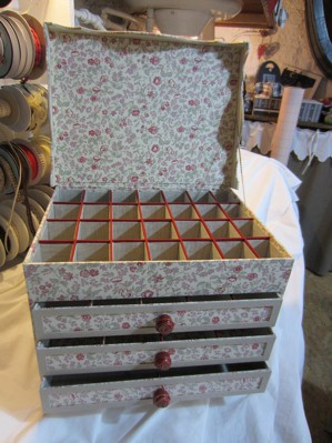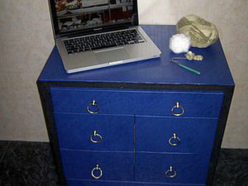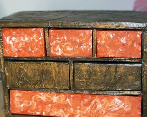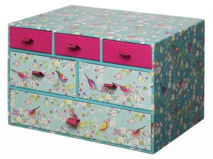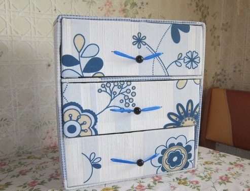 خزانة ذات أدراج صغيرة مصنوعة من الورق المقوى محلية الصنع مزينة بقطعة قماش
