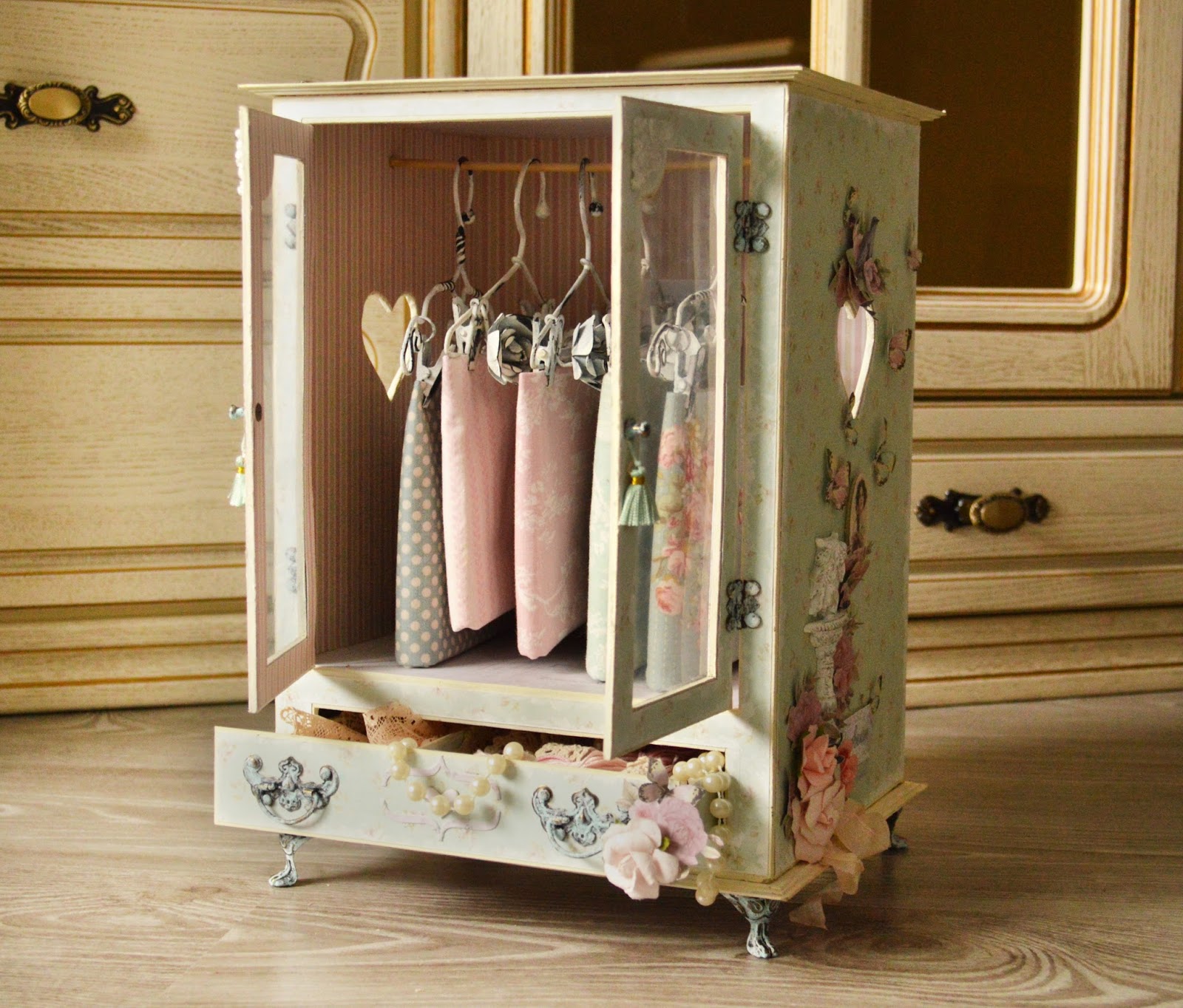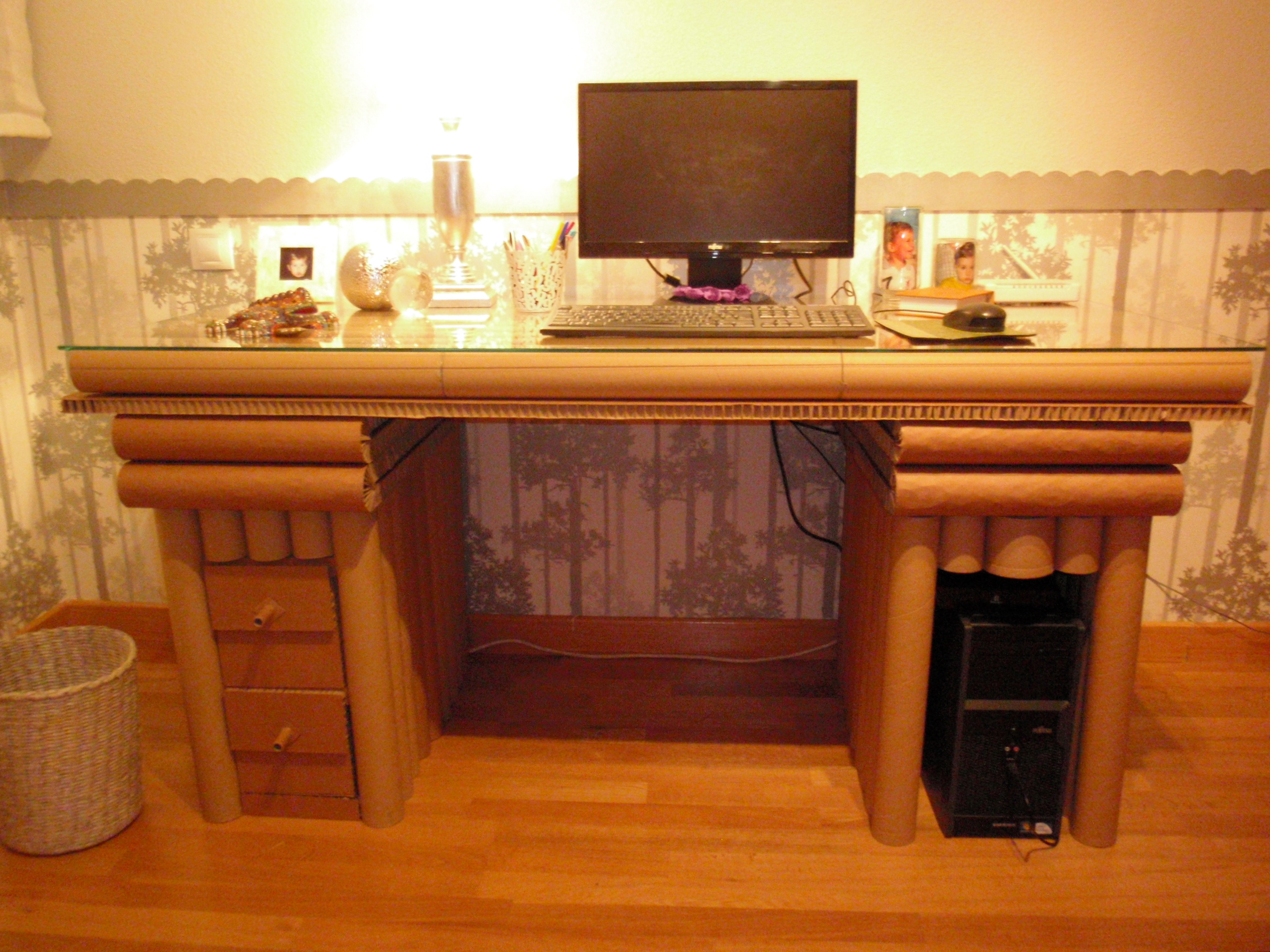 الجزء الأكثر إثارة للاهتمام. هنا يمكنك إظهار خيالك إلى أقصى حد. بالإضافة إلى حقيقة أنه يمكنك إنشاء أثاث من الورق المقوى ذي الشكل الهائل ، لديك الكثير من الاحتمالات لتزيين. نحن نستخدم قاعدة عالمية ، وهي تلتصق جيدًا بالمواد الأخرى ذات الغراء أو الشريط اللاصق.للتصميم ، يمكنك استخدام الورق والأقمشة والطلاء والزخرفة والمجوهرات الطبيعية وأقلام الرصاص - كل ما في متناول اليد.