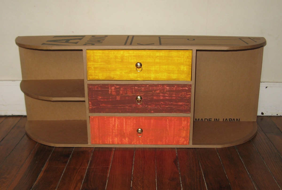 لجعل الأثاث بيديك في المنزل من مواد الخردة ، يجدر بنا أن نتذكر الورق المقوى. إنه مثالي لإنشاء خزانة ملابس أو خزانة ذات أدراج. بالطبع ، سوف تحتاج إلى إطار قوي يمكن تجميعه من الأنابيب البلاستيكية أو الملامح المعدنية.