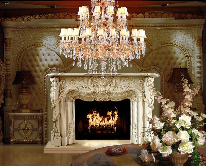 تصميم غرفة المعيشة الفاخرة مع موقد الباروك