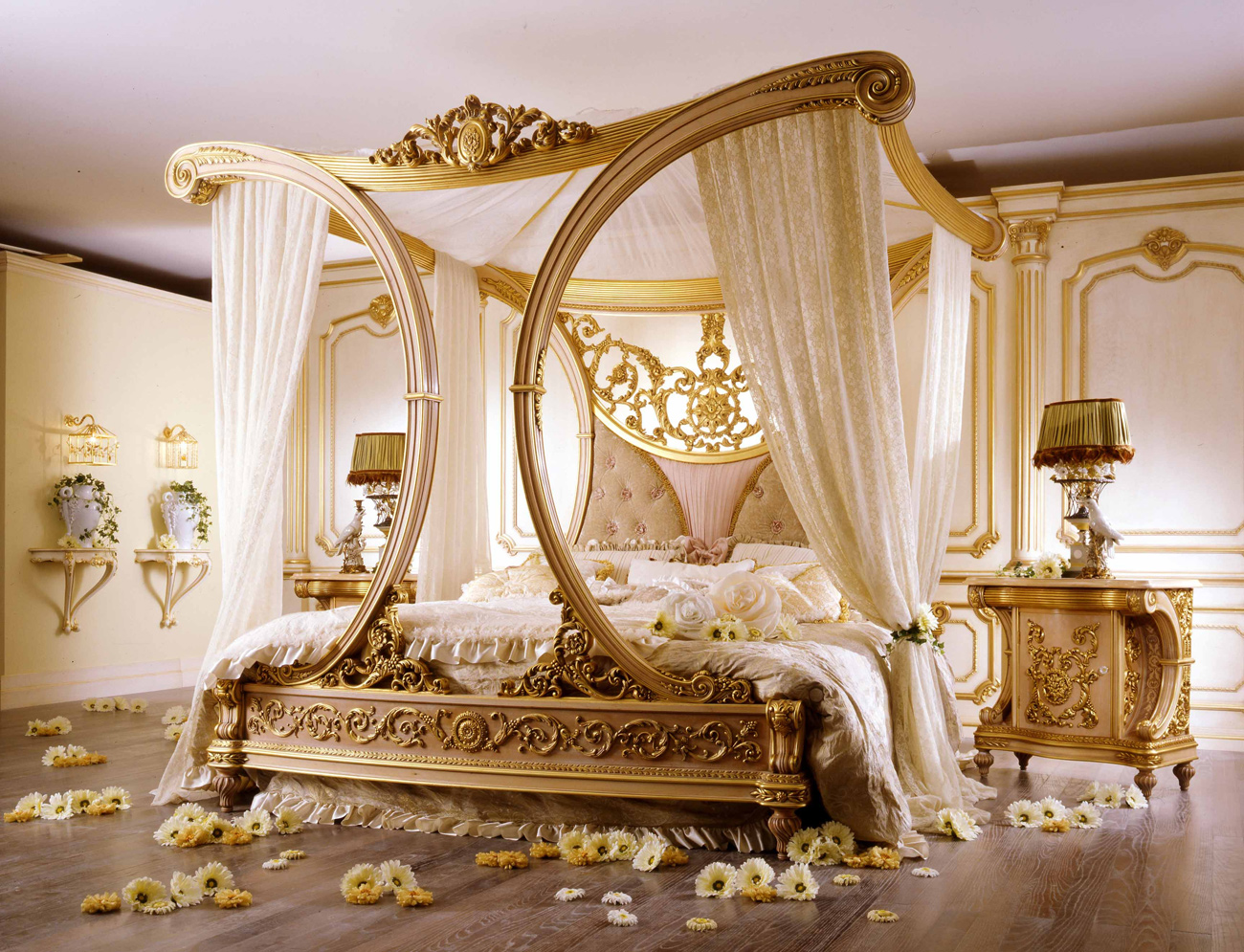أثاث أبيض مع ديكور ذهبي لغرفة النوم على طراز الباروك