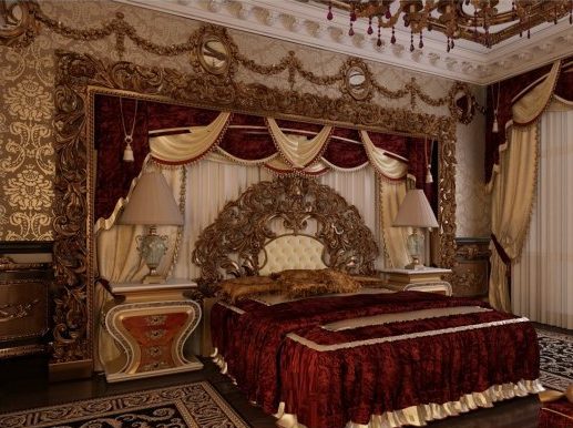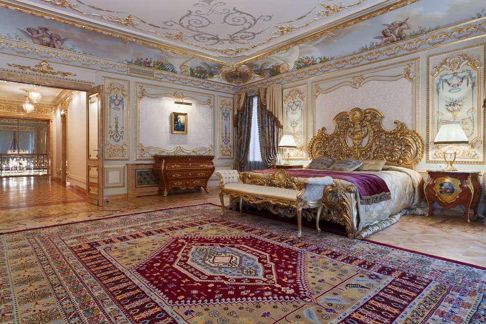 غرفة نوم ملكية واسعة مع مجموعة كاملة من الأثاث الباروكي