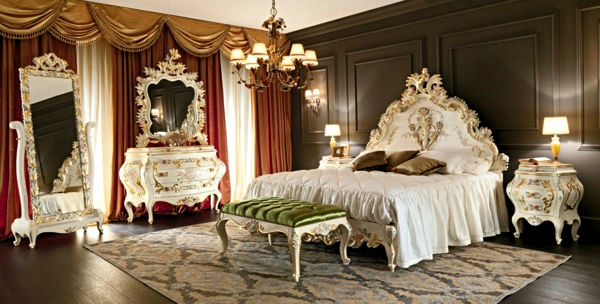 سرير في مكانة غرفة نوم مع ديكور الباروك الغنية الجميلة.
