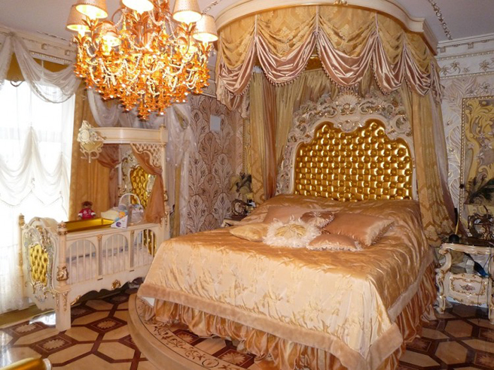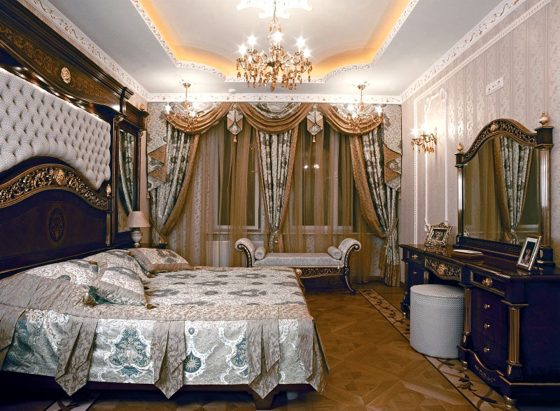 كل شيء مهم هنا: من النمط على الأرض إلى الجص على السقف. حتى عناصر الديكور: ثريا كريستال كبيرة ، سجادة فارسي ، ستارة سرير تخلق هالة خاصة ، تدعم الاتجاه العام للمفهوم.
