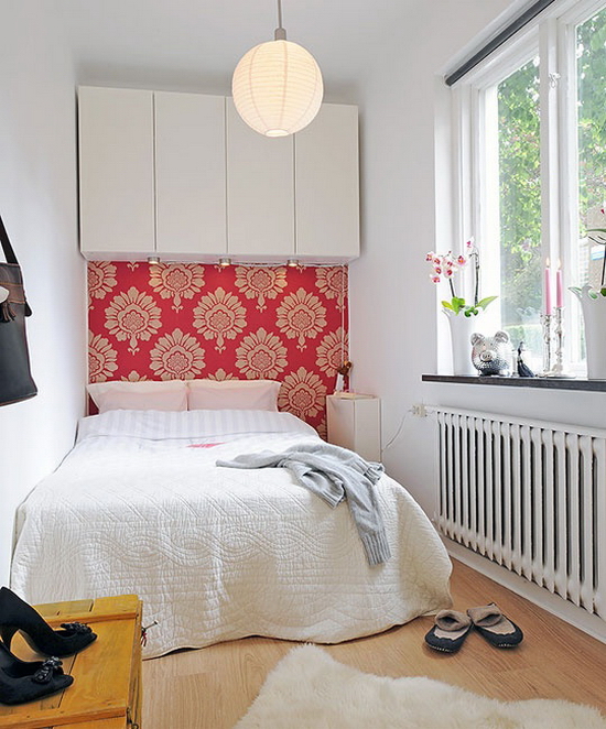 تبدو الخطوط البسيطة ، والثريا غير العادية ، والجدار باللون الأحمر بسيطة ومناسبة في غرفة النوم الصغيرة.