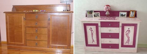 أصبحت الألوان الفاتحة في عالم الموضة الآن ، ولكن يمكنك إعطاء الأثاث ظلًا ساطعًا أو الطلاء بلون محايد ، وتطبيق صورة ولصقها بورق الجدران وورق الهدايا والأفلام. استخدام تركيبات جديدة. إذا كنت ترغب في الرسم ، ضع بعض الصور على الباب. لا تملك الصبر ، والعصا الملصقات ، وتغطي السطح مع الورنيش واضحة. إذا كان بوفيه خشبي ، لطلاء فمن الأفضل استخدام الورنيش. سيكون لديك شيء فريد ، وسوف تستمر لفترة طويلة.