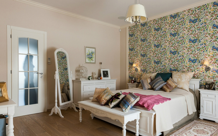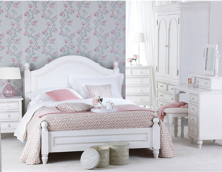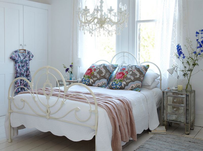 غرفة نوم بيضاء على الطراز الريفي مع زخارف نباتية زاهية