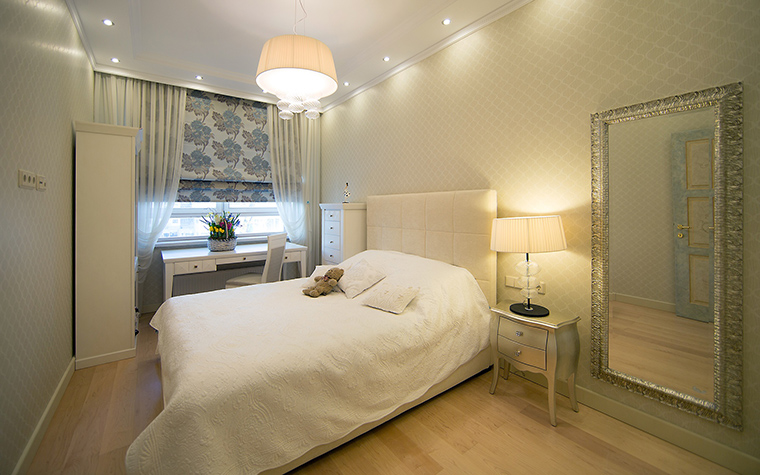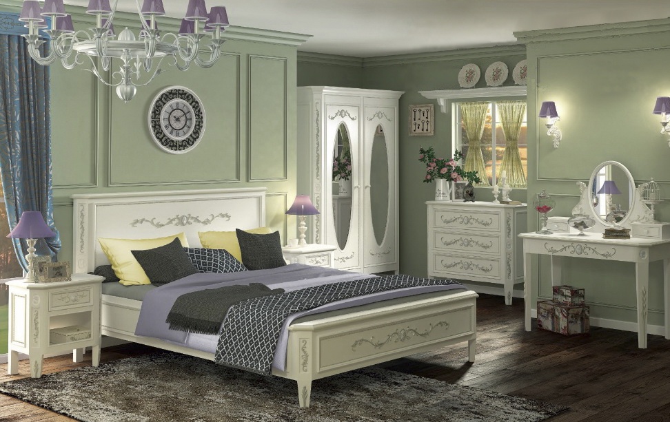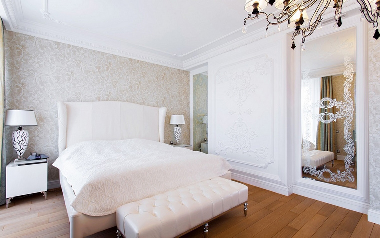 - يعد السرير الأبيض الخشبي الموجود في الجزء الداخلي من غرفة النوم بتصميم كلاسيكي هو العنصر الرئيسي في الغرفة. جميع البنود الأخرى لا ينبغي أن يكون لها تباين كبير معها. يوصى بإجراء انتقالات سلسة في درجات الألوان: من الأبيض إلى الكريم ، الكريمي ، اللبني ، البيج. يمكن أن تكون الملحقات ذات شكل غير عادي ، مع أنماط ورسومات.