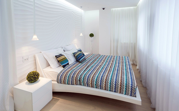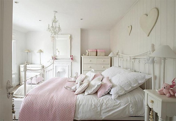 تصميم غرفة النوم مع الأثاث الأبيض يتطلب تخفيف مع الداخلية مشرق. كما يمكن تطبيق لهجات مشرقة: