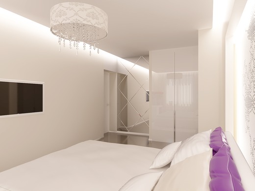 إضاءة إضافية للعناصر الفردية في غرفة النوم ذات اللون الأبيض أرجواني