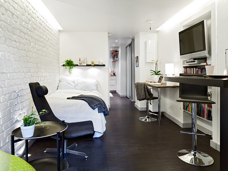 تتكون غرفة النوم الصغيرة الحجم بألوان بيضاء مع عناصر من لون النعناع الشاحب ، مما يجعل الجو يشبه المنزل