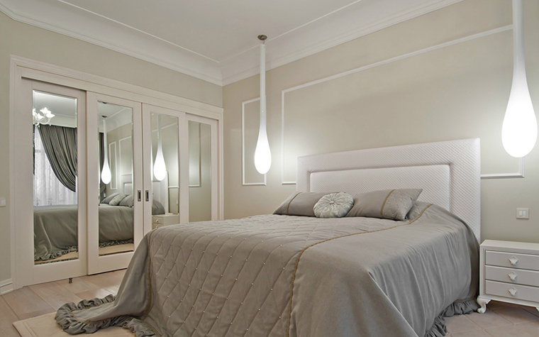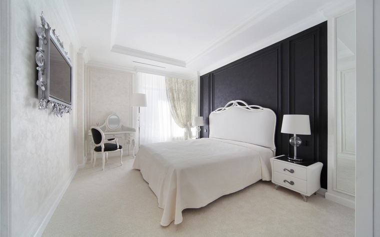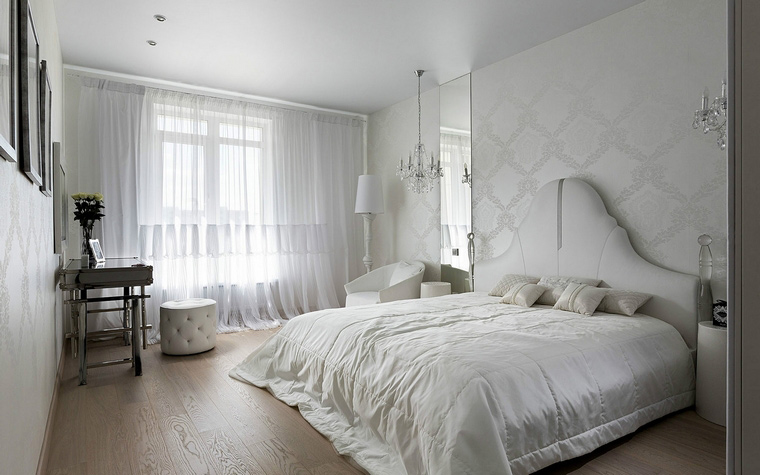 بعد الانتهاء من تصميم غرفة النوم بالكامل باللون الأبيض ، فإننا نجازف بجعل الغرفة تبدو وكأنها جناح في المستشفى. إذا لم تكن لديك مهارات المصمم المحترف ، فيجب ألا تحاول تنفيذ هذا الحل.