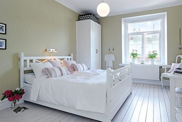 زخرفة الجدران والأرضيات في غرفة النوم البيضاء