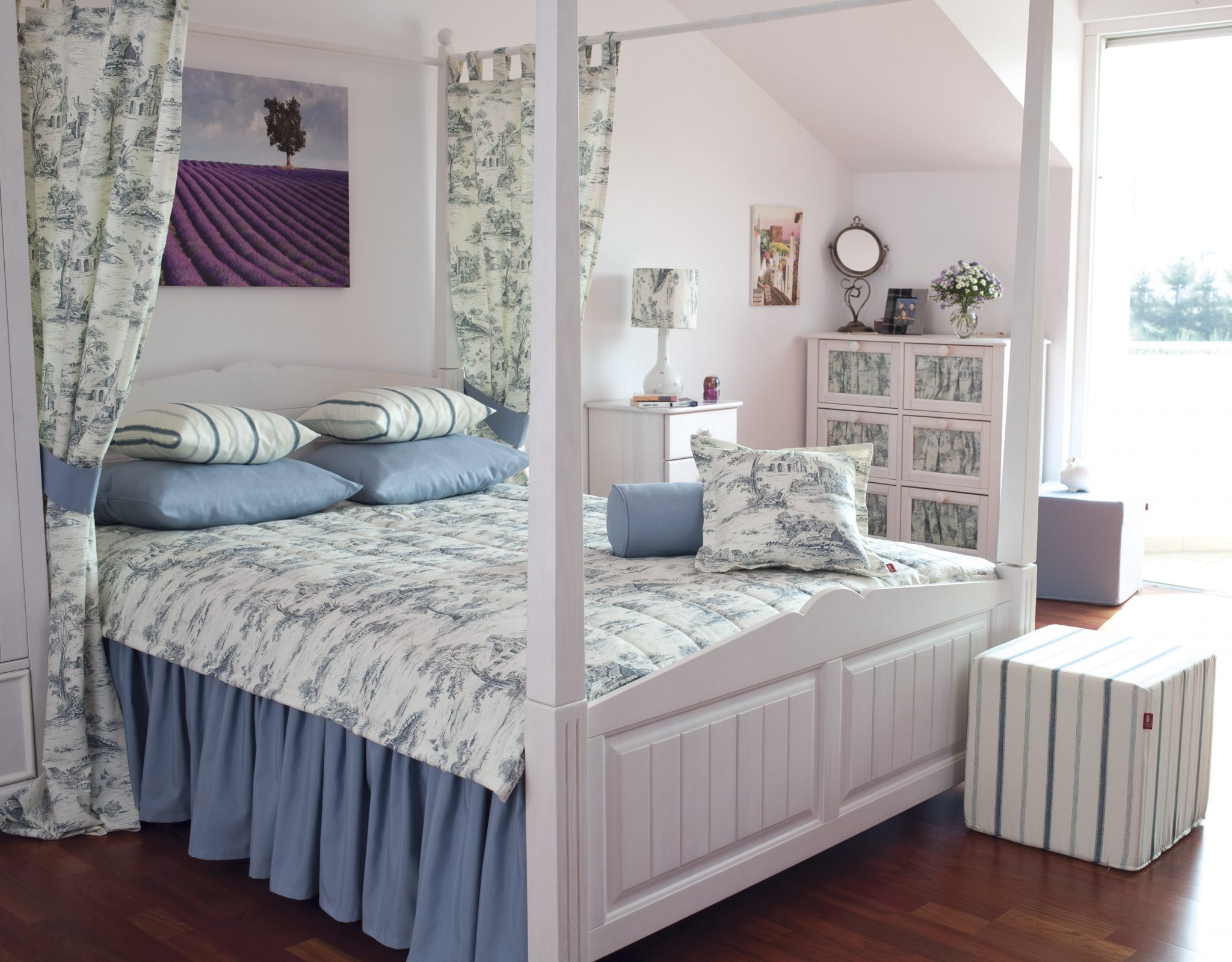 غرفة نوم جميلة وحساسة بألوان زرقاء وبيضاء مع أثاث أبيض عتيق.